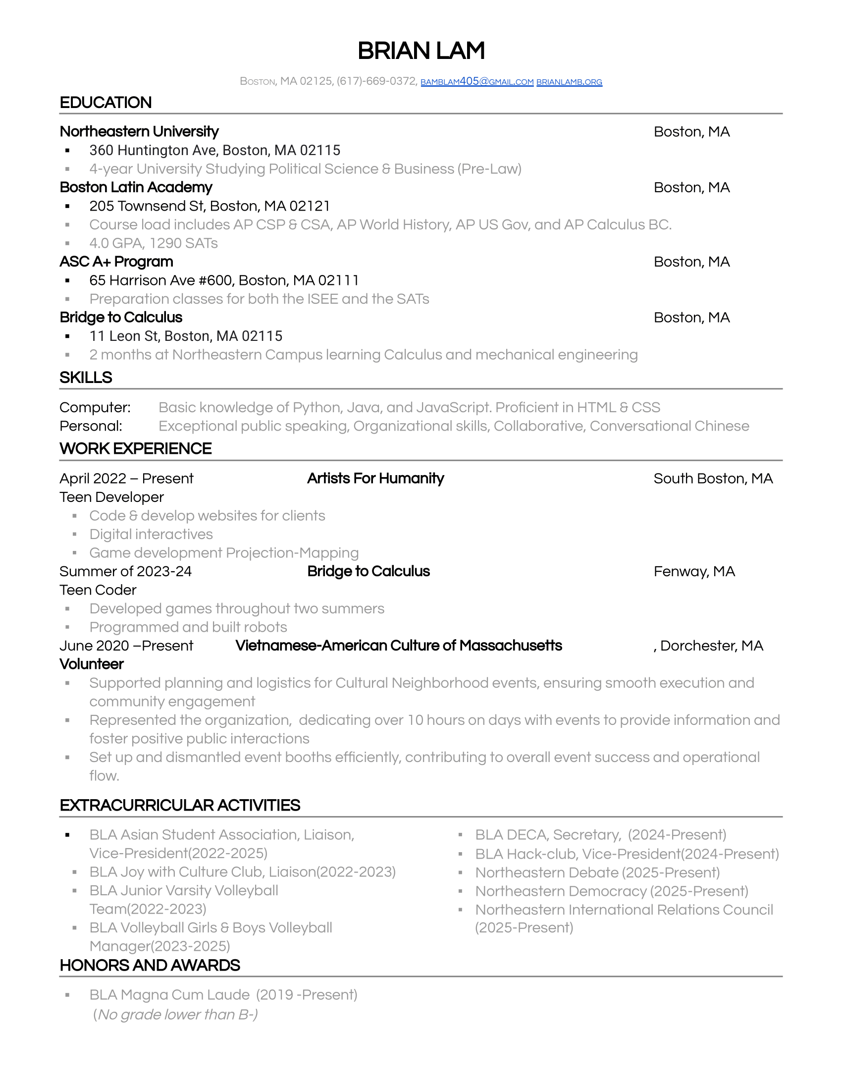 Brian Lam is a 17 year old coder and software developer based in Boston, Massachusetts. He is currently a senior at Boston Latin Academy and is attending further education at Northeastern University.